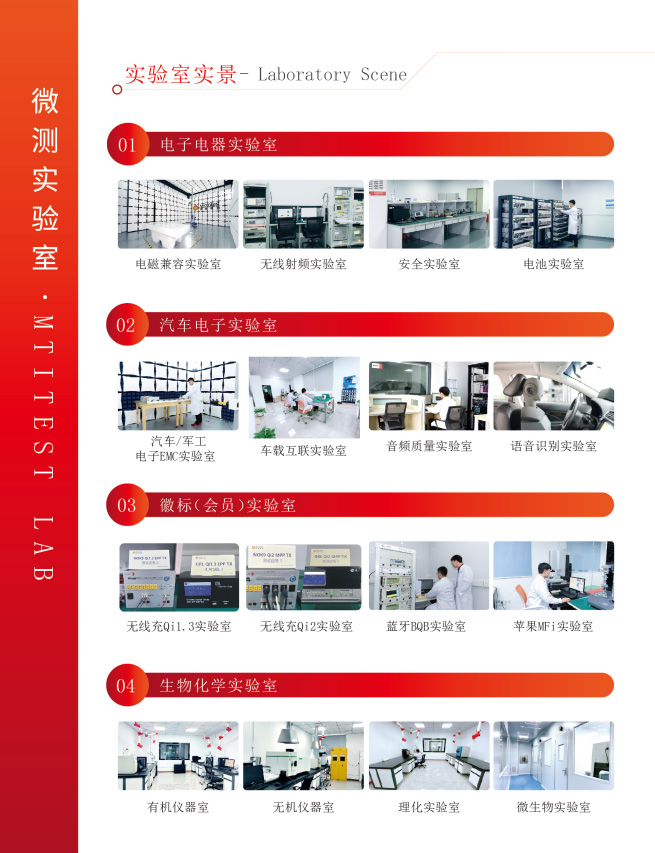 公司拥有20余个专业实验室,128人的工程师团队,10000㎡检测科技园,获得了CNAS、CMA、A2LA、CBTL、WPC、Bluetooth SIG等授权和认可。公司可为企业提供全球上百个国家的测试,包括华为HiCar、无线充Qi、蓝牙BQB、苹果MFi等众多服务。无论企业身处何地,无论产品类型如何,微测检测都能提供一站式解决方案,帮助企业顺利进入全球市场。